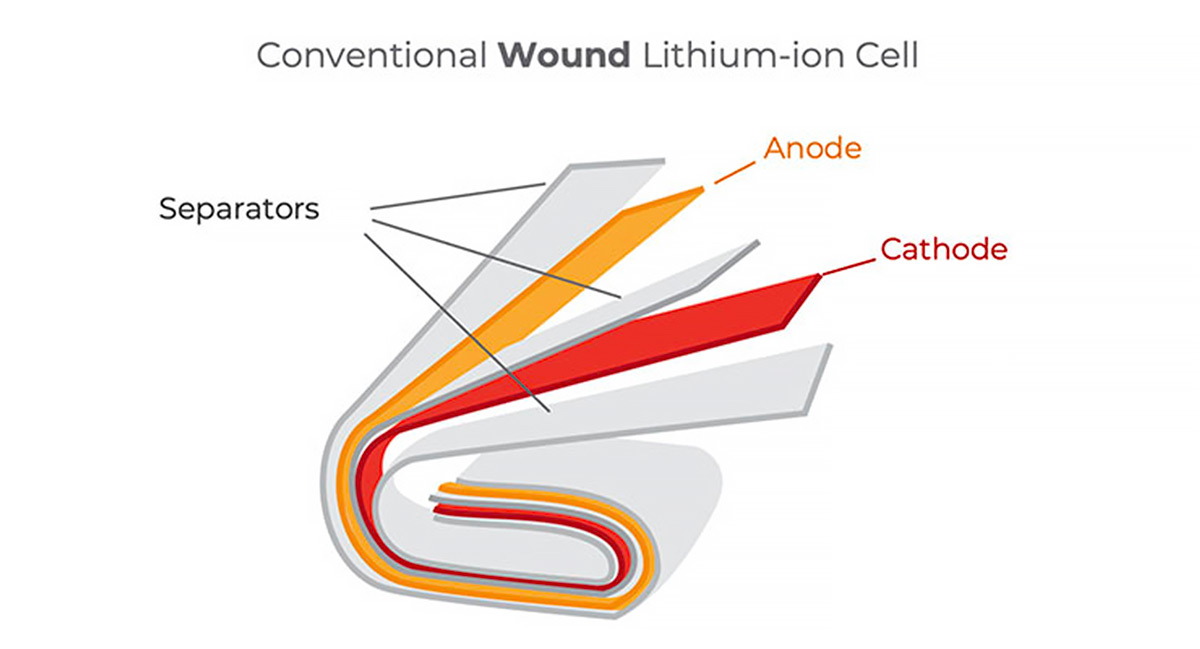 Typically, strips of cathode, anode, and separator are wound together to make today’s lithium-ion battery cells.