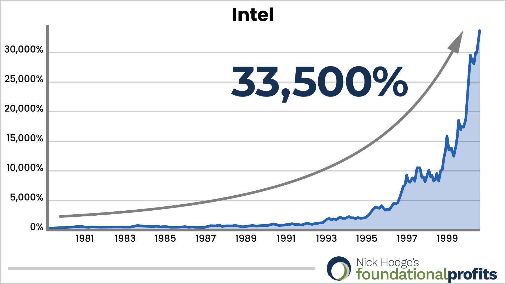 Of course, Intel made early investors rich, soaring for 33,500% gains over the 1980s and 1990s...